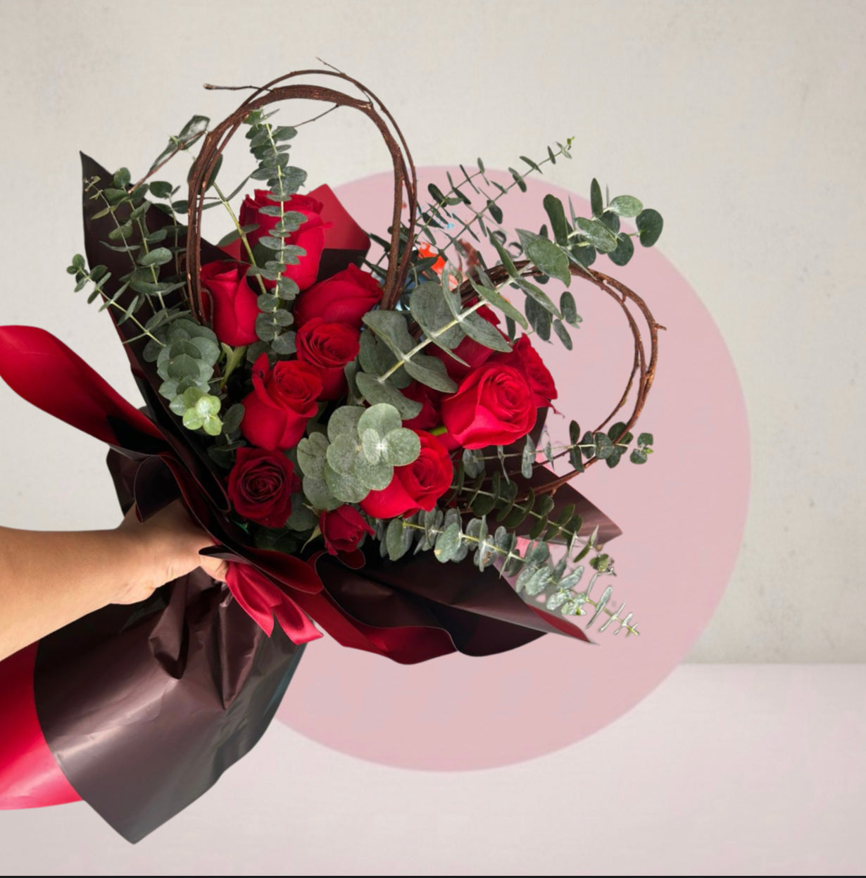 Descripción: Distinción y contraste en un solo arreglo. En el ramo Aura Carmesí, las líneas verticales del eucalipto y las curvas de las ramas naturales crean un juego visual único que dirige la mirada hacia la intensidad de nuestras rosas seleccionadas. Presentado en papel coreano de alta gama en colores oscuros para resaltar el brillo de cada pétalo.