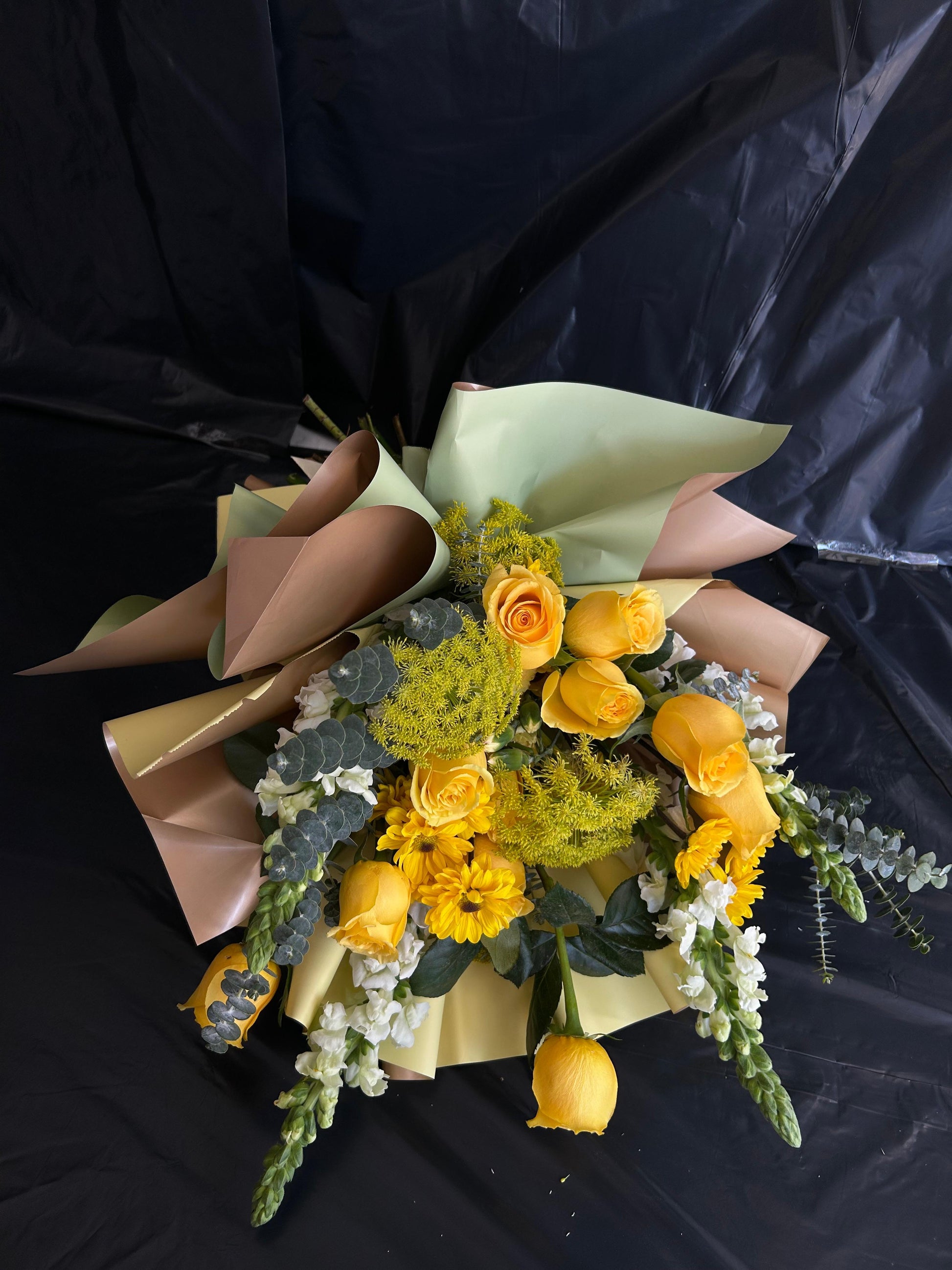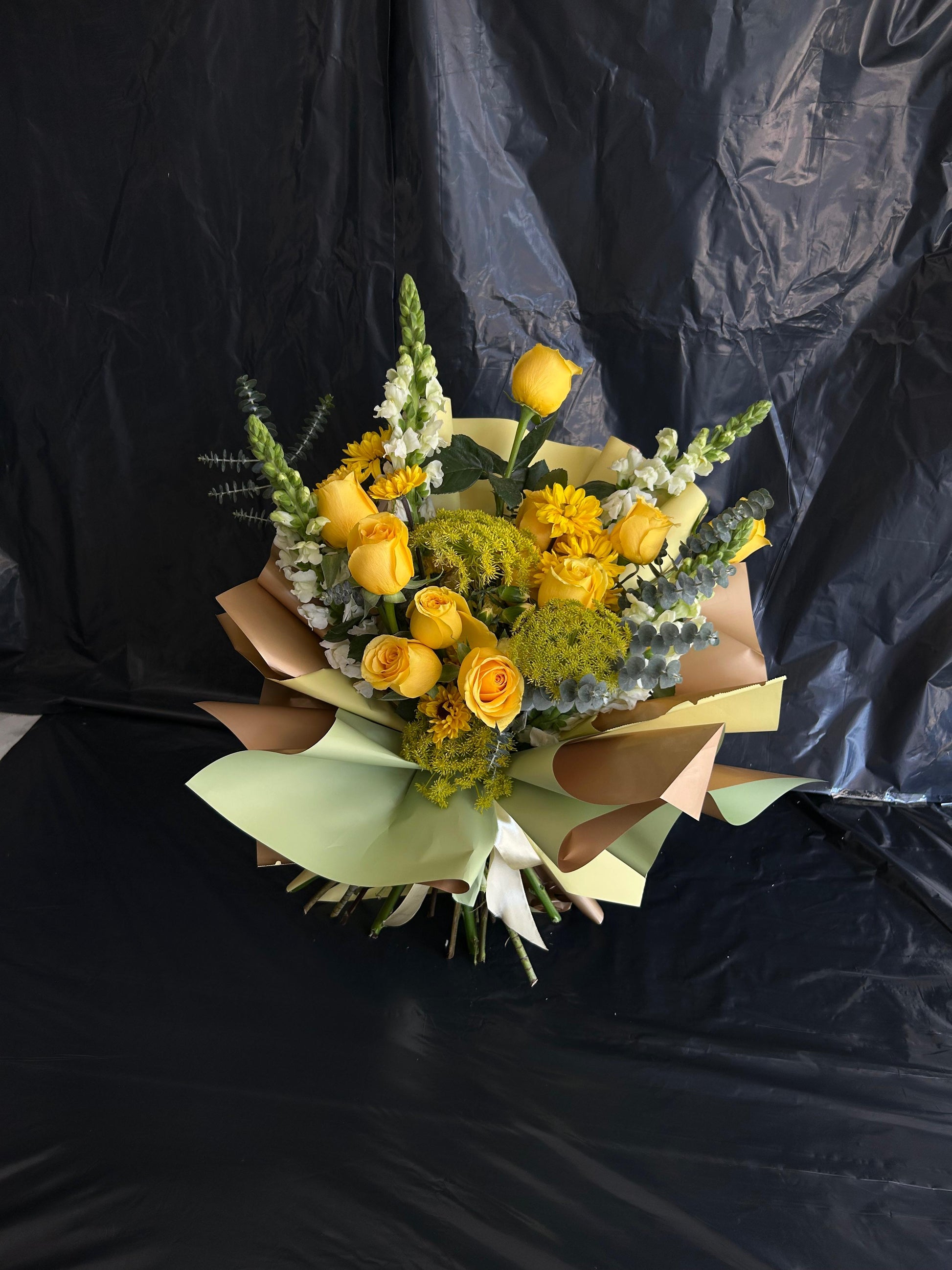 Un ramo lleno de luz y frescura, perfecto para transmitir alegría y optimismo. Con la elegancia de 12 rosas amarillas, la suavidad de los perritos y el toque delicado del encaje, este arreglo combina armonía y calidez. Las margaritas amarillas y el dólar complementan la composición, dándole un aire natural y vibrante.
