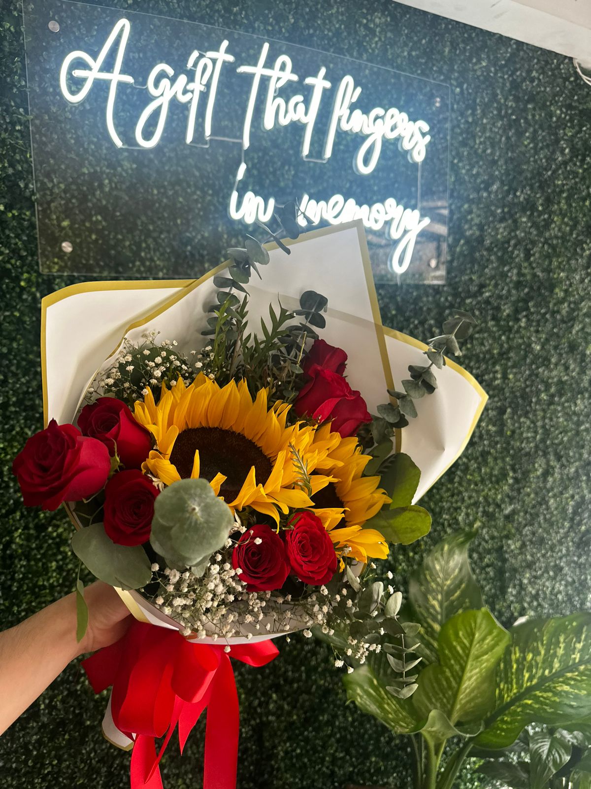 Un radiante ramo que combina 2 girasoles vibrantes con 10 elegantes rosas, rodeado de fresco follaje. Los girasoles aportan un toque de calidez y energía, mientras que las rosas añaden un aire de sofisticación y belleza. Este arreglo es ideal para transmitir alegría, optimismo y gratitud, siendo el regalo perfecto para iluminar cualquier ocasión especial o simplemente para alegrar el día de alguien querido.