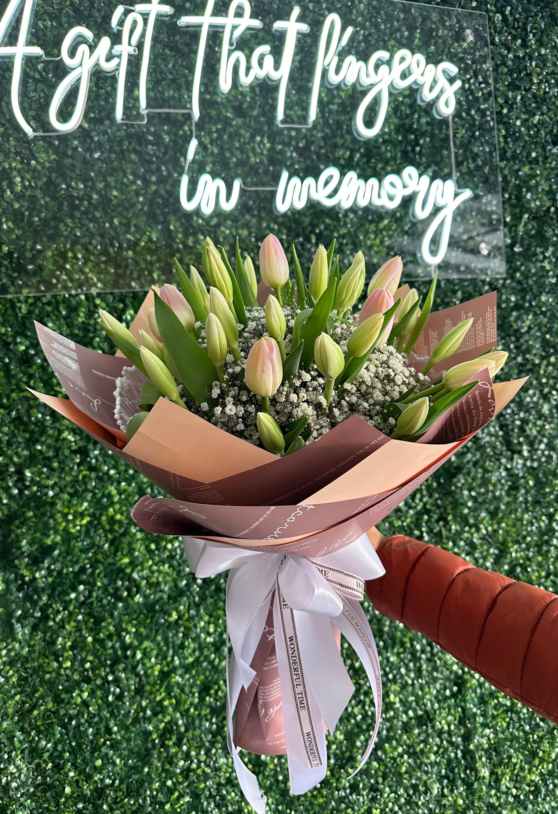 Este ramo de 30 tulipanes, dispuestos en una elegante cascada, crea un efecto visual impactante y sofisticado. Los tulipanes, símbolo de amor perfecto, son una elección perfecta para expresar tus sentimientos más profundos.
